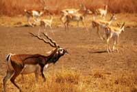 Velavadar has India’s largest population of Blackbuck, the elegant Indian antelope. One of the fastest mammals in the world, the Blackbuck is capable of achieving high speeds when leaping over the plains of Velavadar. India’s largest antelope, the Nilgai or Blue Bull, is easily seen in this national park. Those who stay for a few days at the Blackbuck Lodge can hope to see the endangered Indian Grey Wolf, the nocturnal Striped Hyena, Indian Fox, Golden Jackal, Jungle Cat and many small mammals like hare, gerbil, field mice, mongoose and hedgehog. |