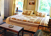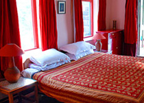 Richly decorated in warm reds and copper tones with full length silk curtains, there is a large double/twin bedroom and a very special Raj Bathroom'. This huge pink marble room features a large shower and a big bath, which has a picture window looking out onto the mountains (with one-way glass!). Guests may enjoy a relaxing candle-lit bath strewn with rhododendron petals, or with essential oils.