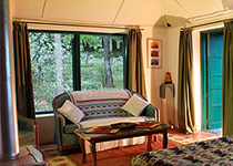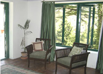 The large windows look out to the left on the forest of Deodars Himalayan cedars and Rhododendrons, and in front to the mountains. Decorated with Tibetan art and soft colours, the large double/twin bedroom can accommodate extra beds if needed. It has a big en suite pink granite bathroom and doors onto the verandah. Between the Green Room and the Deodar Room is a wall of folding doors, making one very large and spacious wood-floored room useful for Yoga groups and others. With dimensions of approx. 50 ft x 12 ft, it can accommodate large groups, for use as a conference room, dormitory or exhibition space. |
