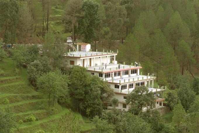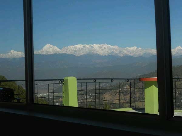 view of snow capped Himalayan peaks and verdant Kumaon valley.