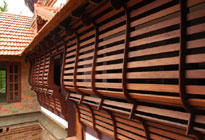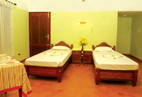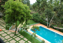Large rooms with king-sized beds and attractive hardwood furnishings. Twin-bed option available. Ensuite bathrooms. Large luxury swimming pool with border of hibiscus flower and coconut trees. Friendly, experienced staff. Wireless internet available throughout building and grounds. Quiet setting free of noise and air pollution. Beautiful grounds with traditional Kerala seating areas Lush vegetation and garden, including mango, jackfruit, banana and guava trees. Abundant birdlife: kingfishers, woodpeckers, etc. Spacious comfortable public rooms. Rooftop terrace amid canopy of coconut palms. |