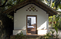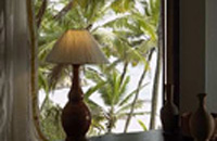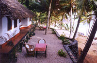 "Karikkathi Beach House has two double bedrooms with a linked lounge room in between. The roof is still kept thatched with palm leaf mats, on the continued suggestions from the guests who have stayed here. The rooms do not have air-condition or television. But they are naturally ventilated as well as by overhead fan. Since the house is both seafront and beach view, water is visible through all the windows of the house. Kitchen is adjacent to accommodation, ie- under same roof.