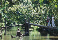 Coconut palm bridge : Kuttanad has a large network of small and large canals. Single large coconut palm tree is put across to bridge the canals. |