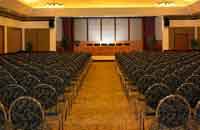 Standard meeting room set up includes floral arrangement, bottled water, mints, flip-chart, markers, stationary, sound system, cordless microphones and amplifiers, stage and seats arranged in theatre style.